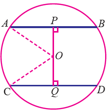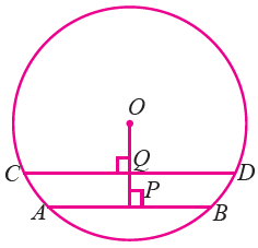 In the figure given below, AB and CD are two parallel chords of a circle with centre O and radius 5 cm. Such that AB = 8 cm and CD = 6 cm. If OP = AB and OQ ⊥ CD.determine the length PQ.