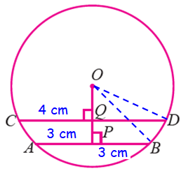 OD2 = OQ2 + QD2 52 = OQ2 + 42 25 = OQ2 + 16 OQ2 = 25 - 16 OQ2 = 9 OQ = √9 OQ = 3 cm |
