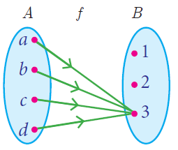 A function f : A -> B is called a constant function if the range of f contains only one element. That is, f (x ) = c , for all x ∊ A and for some fixed c ∊ B .