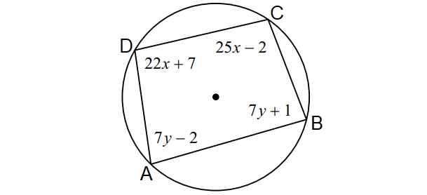 m∠A + m∠C = 180° 7y - 2 + 25x - 2 = 180 25x + 7y - 4 = 180 25x + 7y = 184 ----(1) |