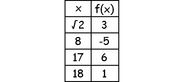 Suppose f is the function whose domain is the four numbers {√2, 8, 17, 18}, with the values of f given in the table shown here in the margin.