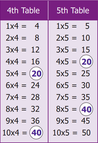 Observing the multiplication tables, can you find the multiples (product of numbers) that are the same in the 4th table and 5th table ?.