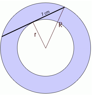 Two concentric circles have a chord running through the outer one. The chord is the tangent of the inner circle and is 14 cm.The outer circle is shaded and the inner circle is not. Find the exact area of the shaded region without using a calculator.