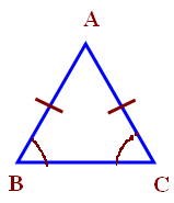A triangle with two equal sides is called isosceles triangle. The angles which are opposite to equal sides are equal. In the following triangle the sides AB and AC are equal and angles B and C are also equal.