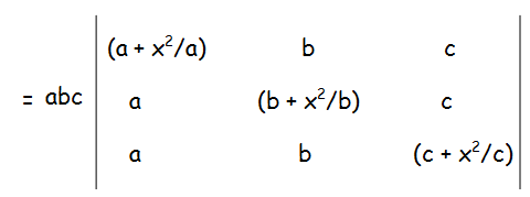 First let us factor "a" from the 1st row, "b" from the 2nd row and c from the 3rd row.