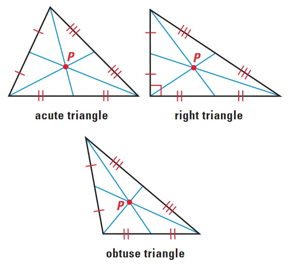 The three medians of a triangle are concurrent. The point of concurrency is called the centroid of the triangle. The centroid, labeled P in the diagrams below, is always inside the triangle.