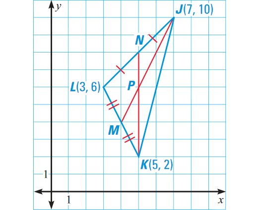 Determine the coordinates of the centroid, which is 2/3⋅6 or 4 units up from vertex K along the median KN.