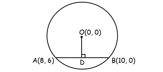 2. O(0, 0) is the center of a circle whose one chord is AB, where the points A and B are (8, 6) and (10, 0) respectively. If OD is the perpendicular from the center to the chord AB, find the coordinates of the mid point of OD.