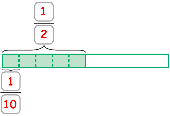 In the diagram given below, 1/2 of a whole is divided into halves and into tenths.