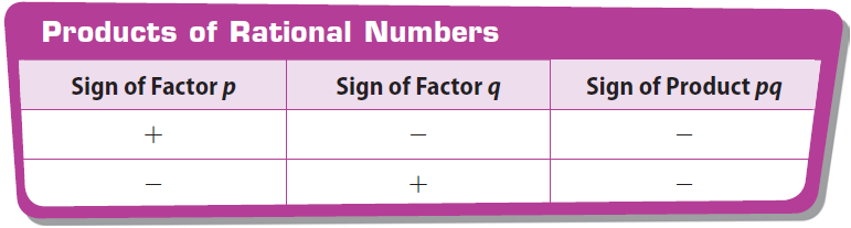 The rules for the signs of products of rational numbers with different signs are summarized below.