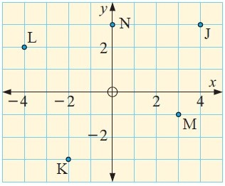 So, the Coordinates of points are J(4, 3), K(-2, -3), L(-4, 2), M(3, -1), and N(0, 3)
