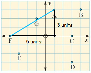In the figure, draw a horizontal segment of length 5 units from F and a vertical segment of length 3 units from A.