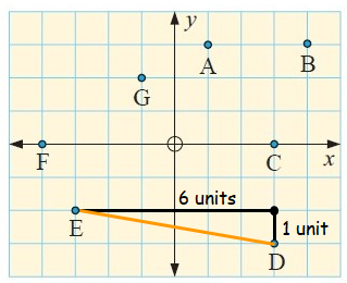 In the figure, draw a horizontal segment of length 6 units from E and a vertical segment of length 1 unit from D.
