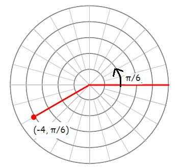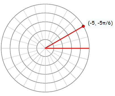 Here r = -5 < 0 then P is on the terminal side of π + θ and θ is negative, so we move clock wise direction and move 150 degree.