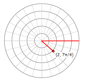 Here r = 2 and θ is positive and its measure is 7π/4 = 315.