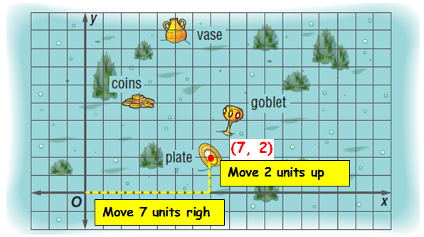 The diagram at the right shows the positions of artifacts found on the ocean floor. Write the coordinates of the location for each object: coins, plate, goblet, and vase.