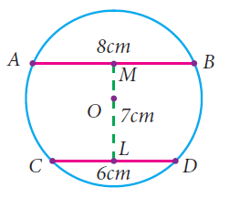 In the given figure, AB and CD are the parallel chords of a circle with centre O. Such that AB = 8cm and CD = 6cm. If OM ⊥ AB and OL ⊥ CD distance between LM is 7cm. Find the radius of the circle.