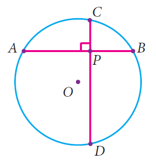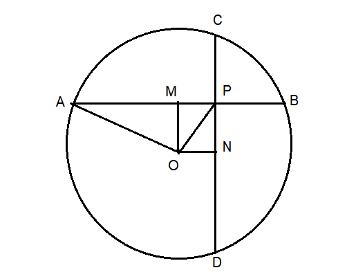 A school wants to conduct tree plantation programme. For this a teacher allotted a circle of radius 6m ground to nineth standard students for planting sapplings. Four students plant trees at the points A,B,C and D as shown in figure. Here AB = 8m, CD = 10m and AB is perpendicular to CD. If another student places a flower pot at the point P, the intersection of AB and CD, then find the distance from the centre to P.