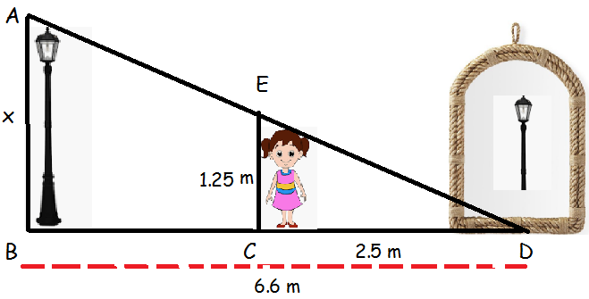A girl looks the reflection of the top of the lamp post on the mirror which is 6.6 m away from the foot of the lamppost. The girl whose height is 1.25 m is standing 2.5 m away from the mirror. Assuming the mirror is placed on the ground facing the sky and the girl, mirror and the lamppost are in a same line, find the height of the lamp post.