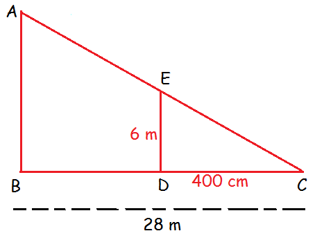 A vertical stick of length 6 m casts a shadow 400 cm long on the ground and at the same time a tower casts a shadow 28 m long. Using similarity, find the height of the tower.