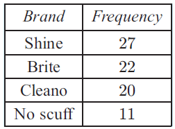 A marketing company surveys 80 randomly selected people to discover what brand of shoe cleaner they use. The results are shown in the table alongside :