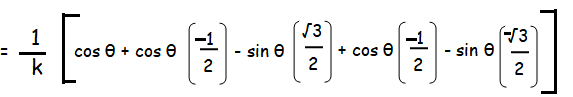 = (1/k) [ cos θ + cos θ cos 2π/3 - sin θ sin 2π/3 + cos θ cos 4π/3 - sin θ sin 4π/3]