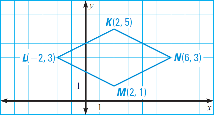 We can use any of the three ways described in the concept summary above. For instance, we could show that opposite sides have the same slope and that the diagonals are perpendicular. Another way, shown below, is to prove that all four sides have the same length.