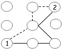 There are two different pathways connecting 1 and and 2. How many fewer steps is the solid line path than the dotted line path. (A step is defined as a line segment connecting 2 circles)