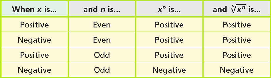 When n is even, you must simplify n√xn, to |x|, because you do not know whether x is positive or negative. When n is odd, simplify n√xn, to x.