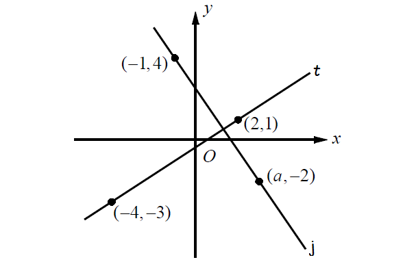 In the xy-plane above, if line t is parallel to line j, find the value of a.
