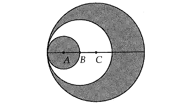 To find the area of the shaded region, we have to subtract the area of circle B from the area of circle C and include the area of circle A.