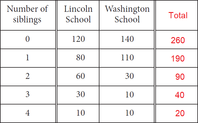 A sociologist chose 300 students at random from each of two schools and asked each student how many siblings he or she has. The results are shown in the table below.