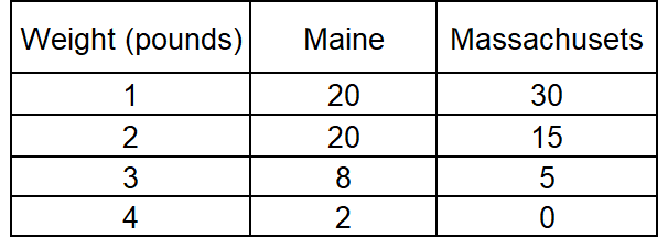 In the table above, for Maine, there are 20 lobsters in the first category 1 pound and 20 lobsters in the second category 2 pounds.