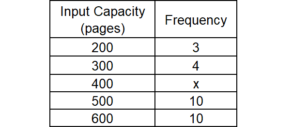 From the table above, there are already 7 printers with an input capacity below 400. So, must have 13 more printers equal to 400, plus one more at 400 to be the median. That's a total of 14 for x.