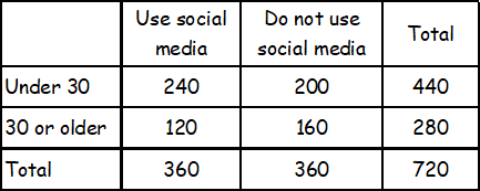 The table above shows the distribution of age and social media presence for 720 employees at a company. If an employee who uses social media is selected at random, what is the probability the employee is age 30 or older?