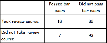 The table above summarizes the results of 200 law school graduates who took the bar exam. If one of the surveyed graduates who passed the bar exam is chosen at random for an interview, what is the probability that the person chosen did NOT take the review course?