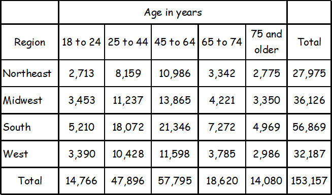 The table above shows the number of registered voters in 2012, in thousands, in four geographic regions and five age groups. Based on the table, if a registered voter who was 18 to 44 years old in 2012 is chosen at random, which of the following is closest to the probability that the registered voter was from the Midwest region?