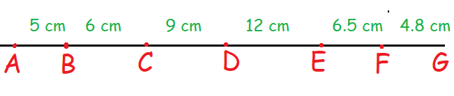 The distance between A to B is 5 cm, B to C is 6 cm, C to D is 9 cm, D to E is 12 cm, E to F is 6.5 cm and F to G is 4.8 cm. Then what is the distance between B to F?