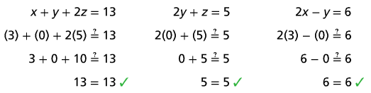 Check that the values x = 3 and y = 0 and z = 5 satisfy the given system of linear equations.