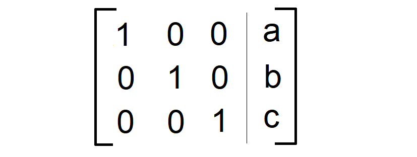 From the above matrix, the solution to the system of three linear equations is (a, b, c).