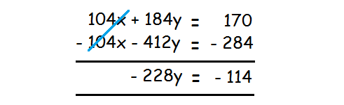 (1) ⋅ 2 --------> 104x + 412y = 284 ----------(3)