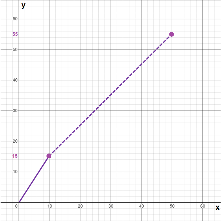 A photocopy store charges $1.50 per copy for the first 10 copies and $1.00 per copy after the 10th copy. Let x be the number of copies, and let y be the total cost of photocopying (i) Draw graph of the cost as x goes from 0 to 50 copies (ii) Find the cost of making 40 copies.