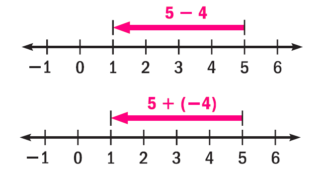We can see from the number lines shown below, the expressions '5 - 4' and '5 + (-4)' have the same value 1.