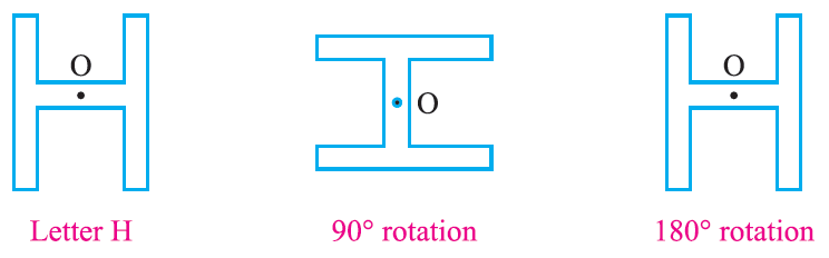 Look at the following figures showing the shapes that we get, when we rotate about its centre ‘O’ by an angle of 90 degree or 180 degree