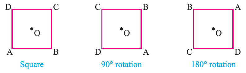 In the case of a square, we get exactly the same shape after it is rotated by 90 degree while in the case of a rectangle, we get exactly the same shape after it is rotated by 180° such figures which can be rotated through an angle less than 360° to get the same shape are said to have rotational symmet-ry.