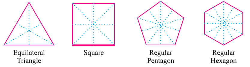 For the given regular polygons find the lines of symmet-ry by using paper folding method and also draw the lines of symmetry by dotted lines.