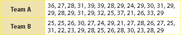 The range of ages for team A is 18 years, while the range of ages for team B is 10 years.