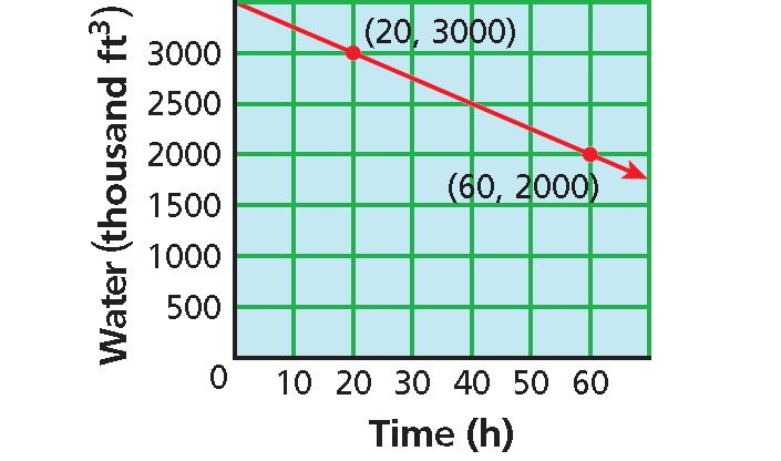 The graph shows how much water is in a reservoir at different times. Find the slope of the line. Explain what the slope represents.