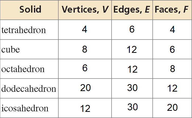 List the numbers of vertices, edges, and faces of each Platonic solid.