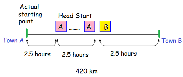 Time taken by car B to meet car A is 5 hours. At the meeting point, car B has traveled 5 hours and car A has traveled 3 hours.